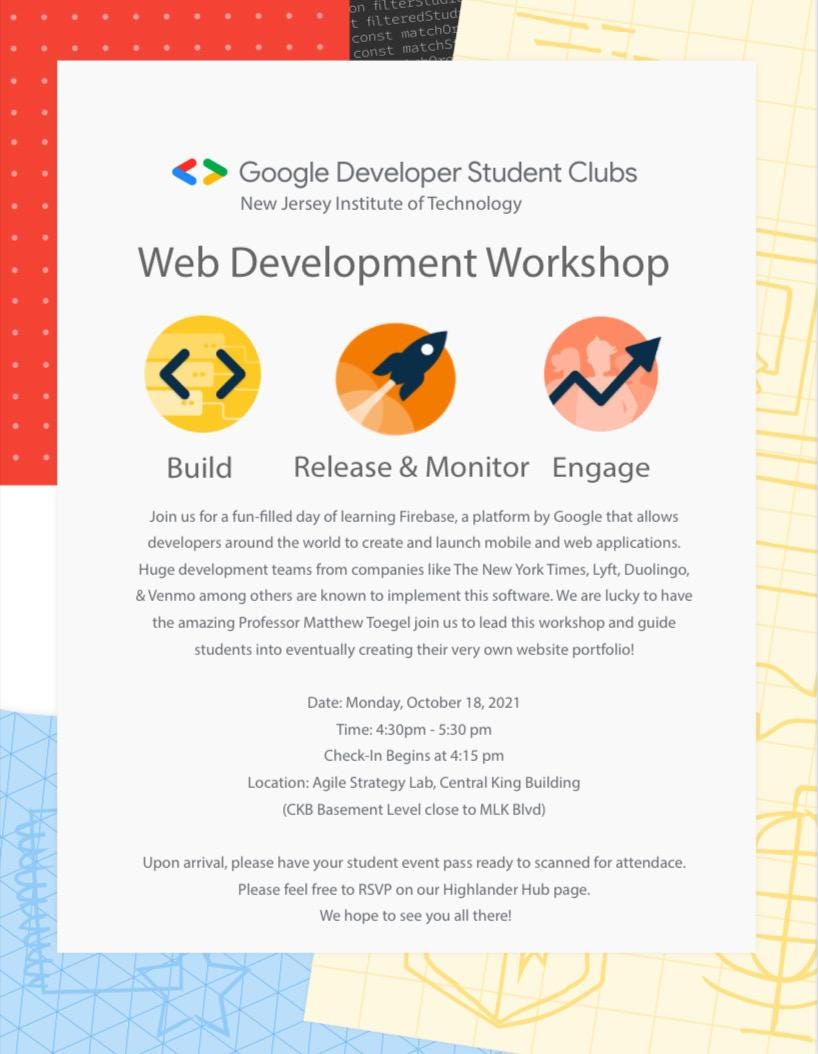 Web Development Workshop 10/18 Info!Natalia SmithOct 16, 202111ShareHello everyone! The Google Developer Student Club is hosting a Web Development Workshop this Monday, 10/18, from 4:30 - 5:30 PM. Check out the flyer below for more info! We hope to see you there.